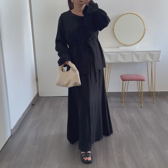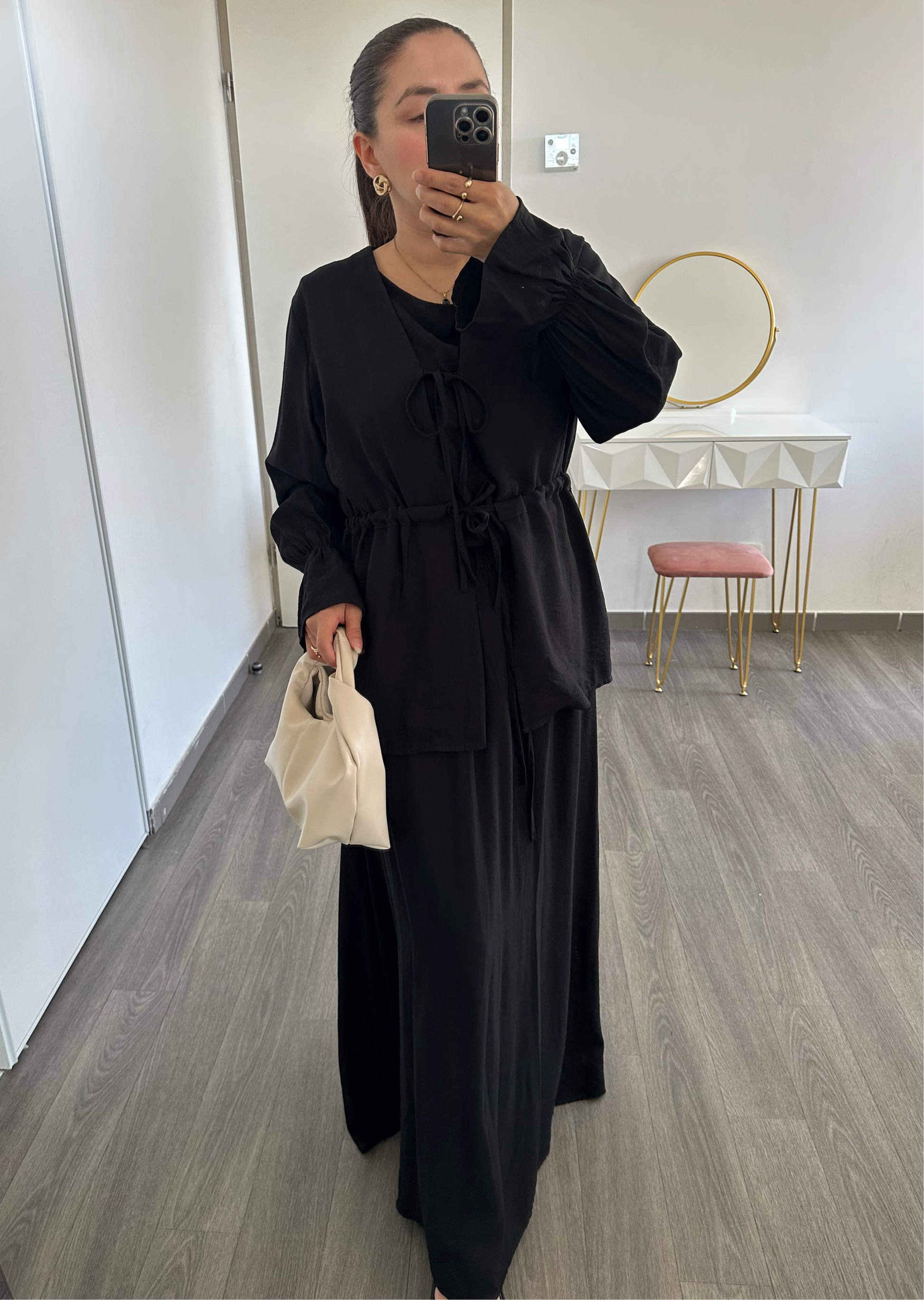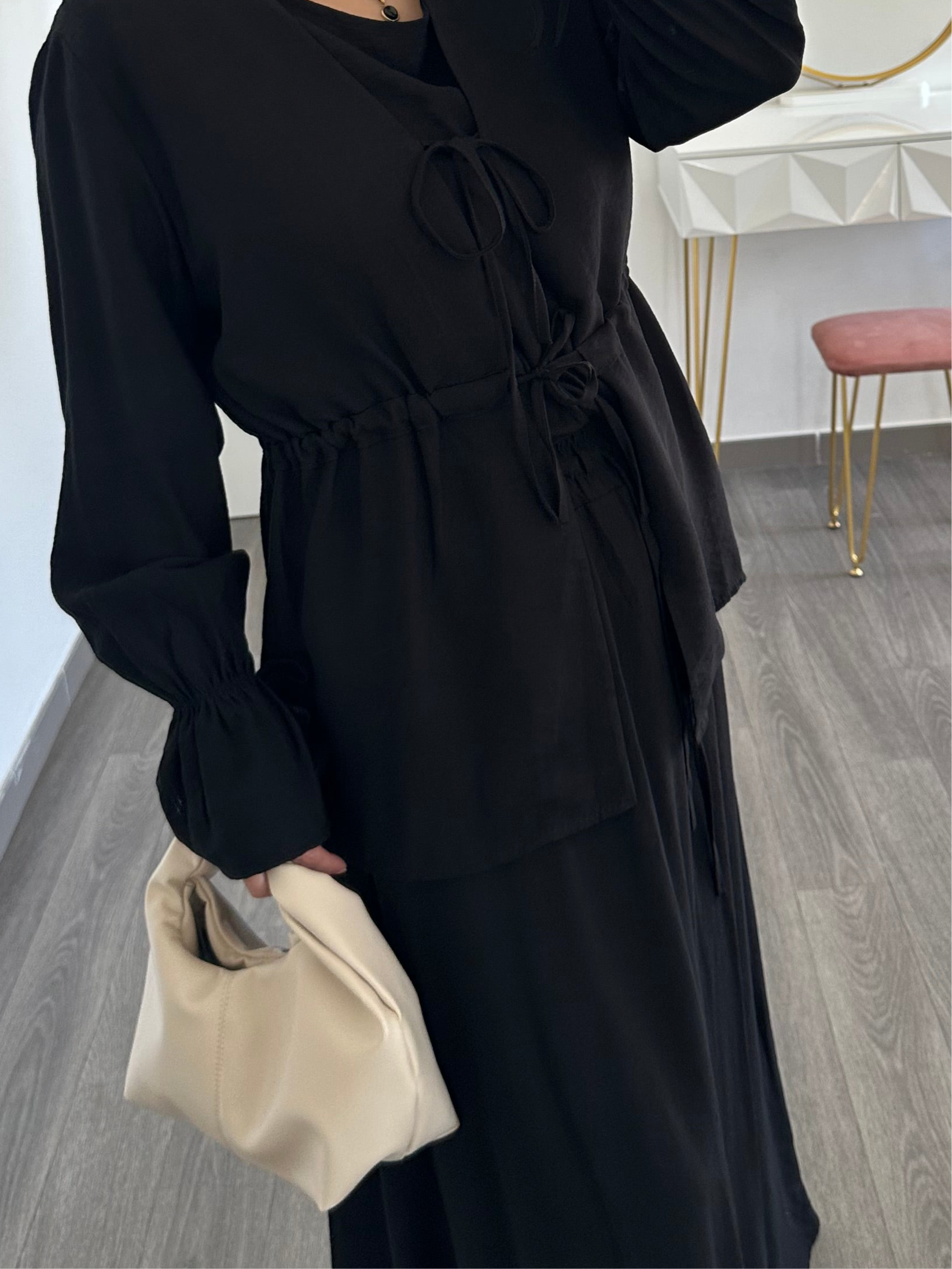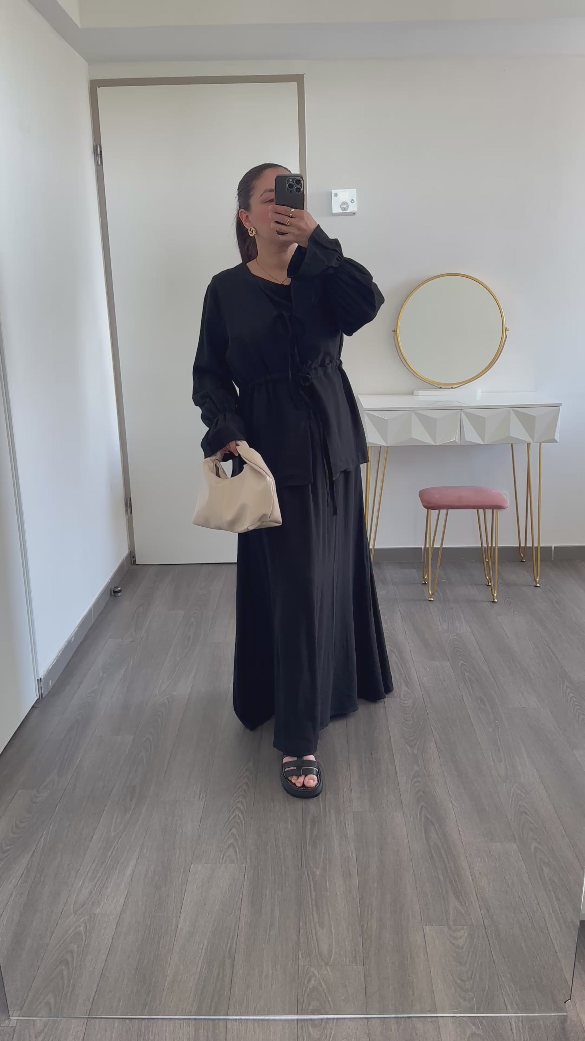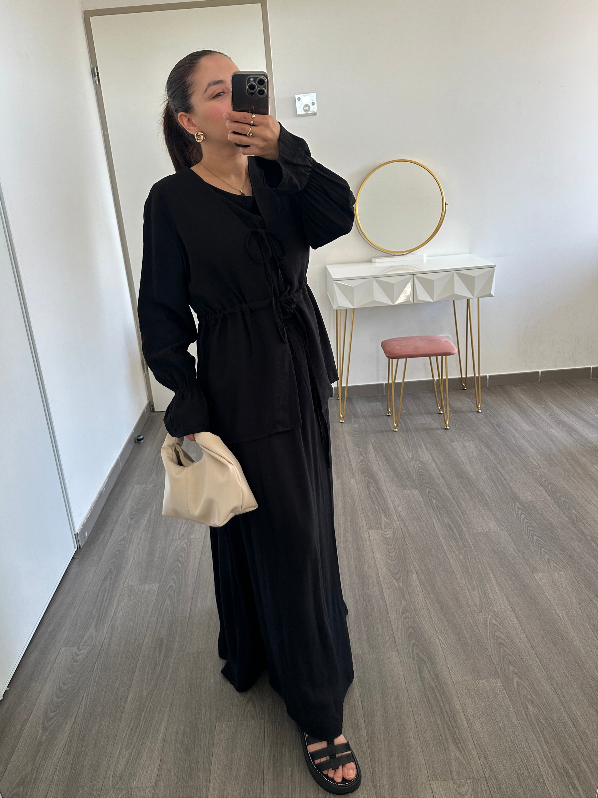 Le noir apporte une touche de mystère, de chic et d’élégance. Facile à accessoiriser, cet ensemble peut se porter avec des chaussures plates, des talons ou même une ceinture plus marquée pour transformer le look.