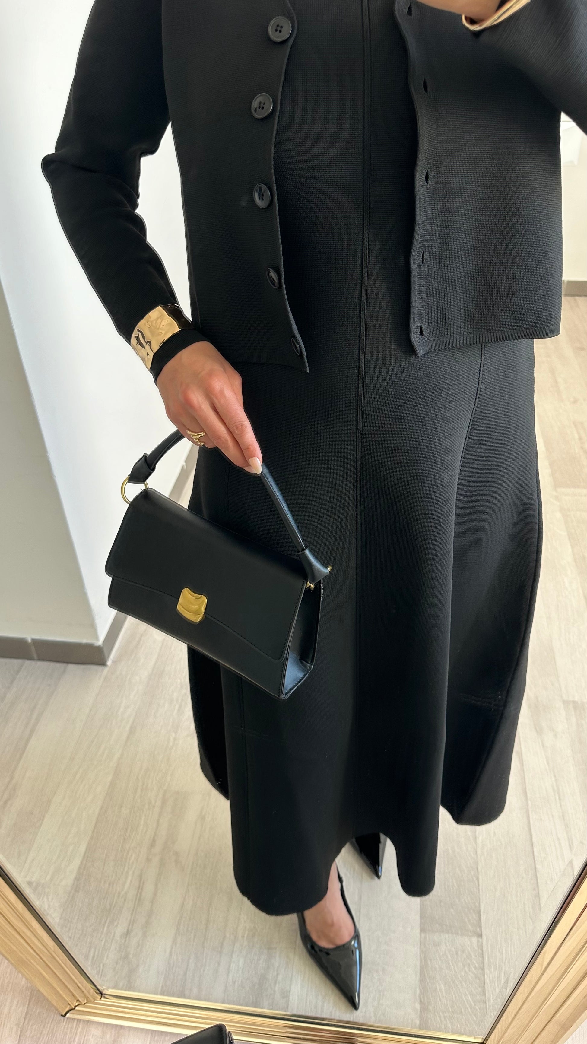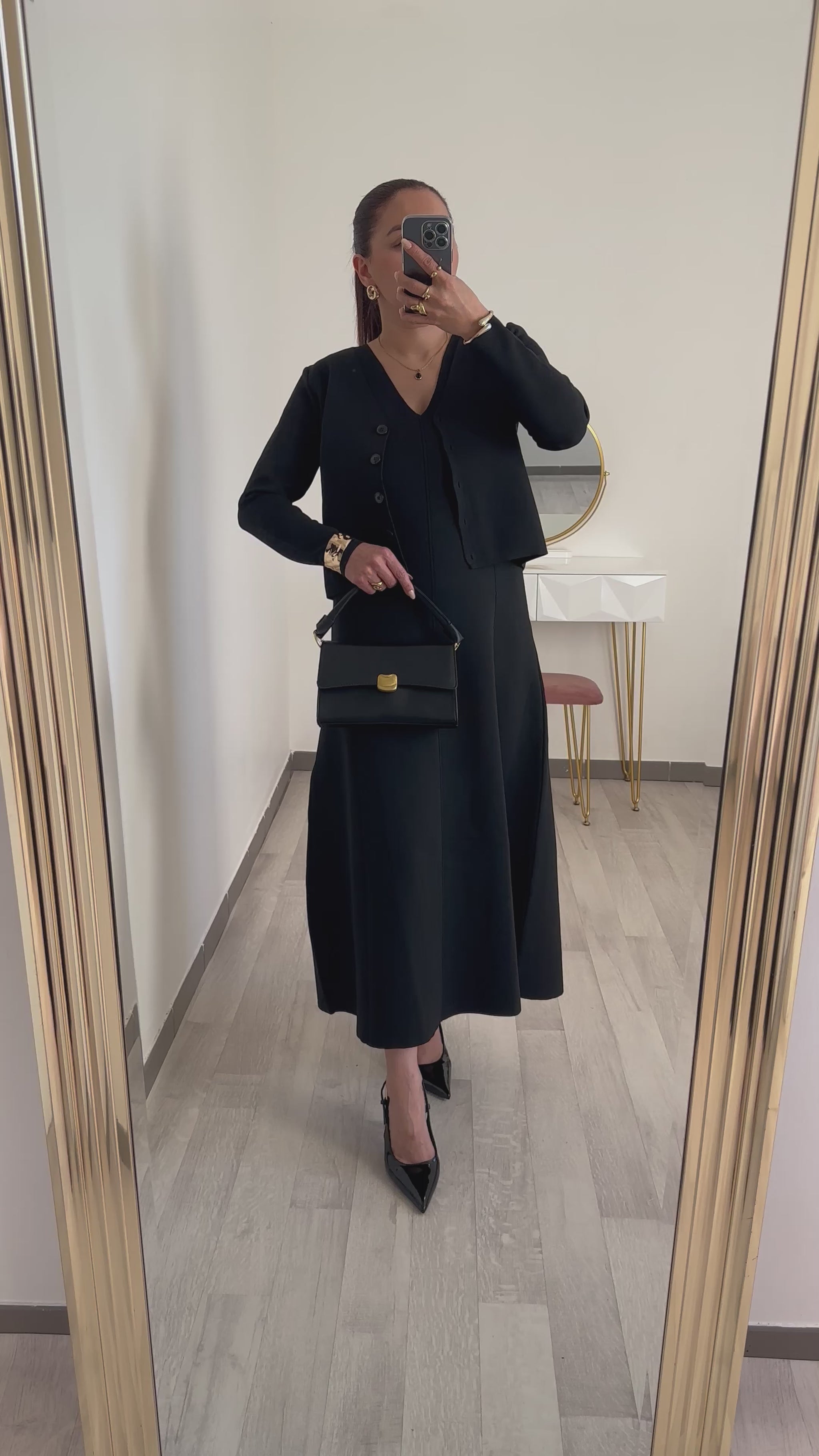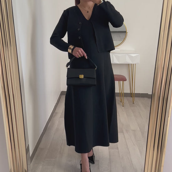 Le cardigan, avec sa coupe courte et ses boutons discrets, complète parfaitement la robe. Il apporte une touche chic et permet de moduler le look selon les circonstances. Porté ouvert ou fermé, il ajoute une note sophistiquée à cette tenue. La sobriété de cet ensemble offre de nombreuses possibilité d’accessoirisation : optez pour des bijoux dorés ou un sac structuré pour sublimer votre style.