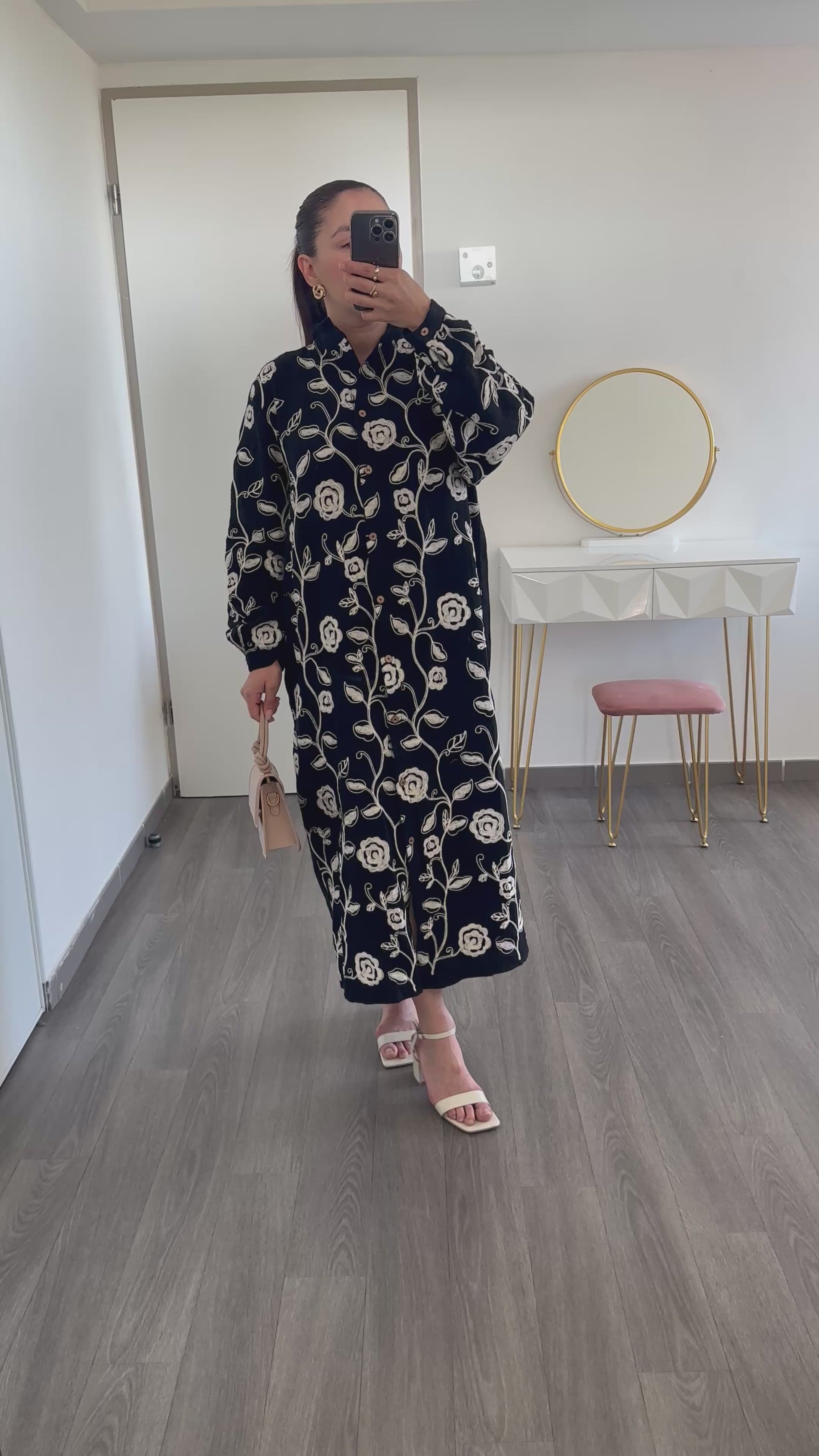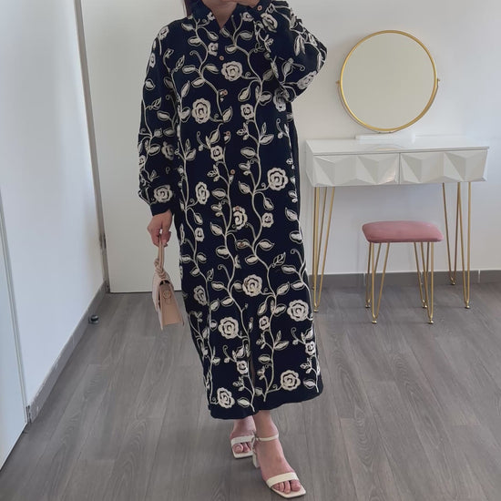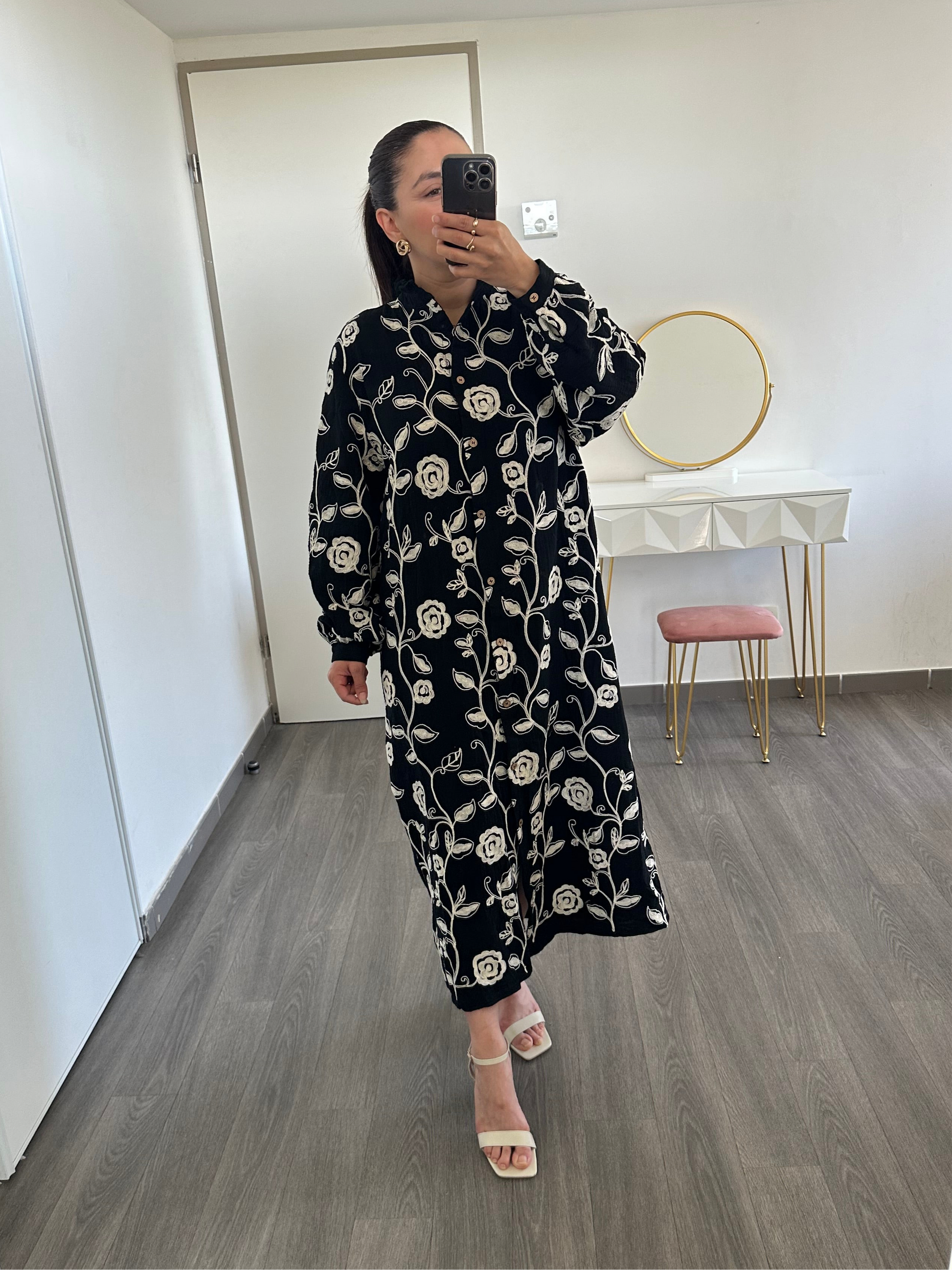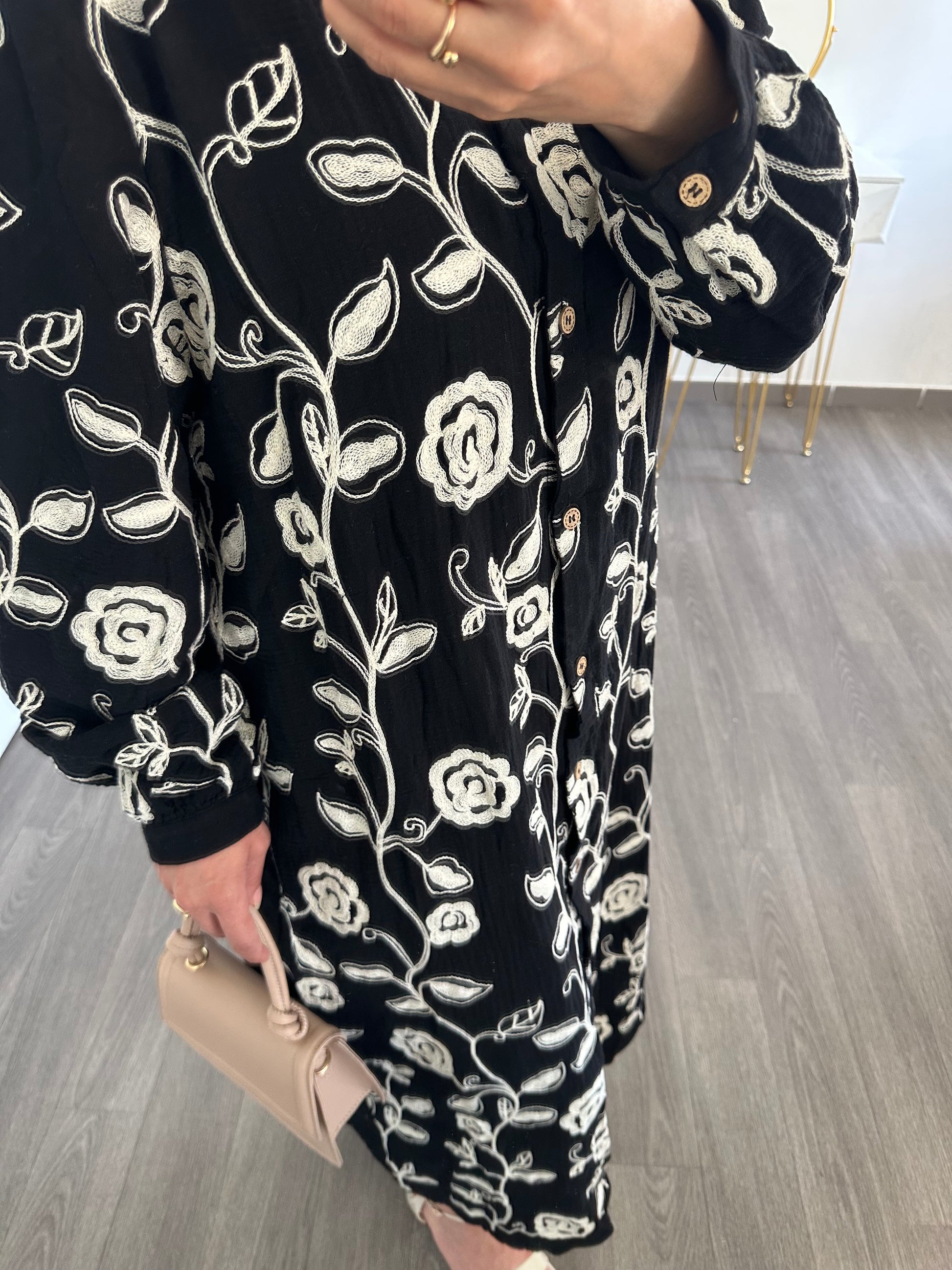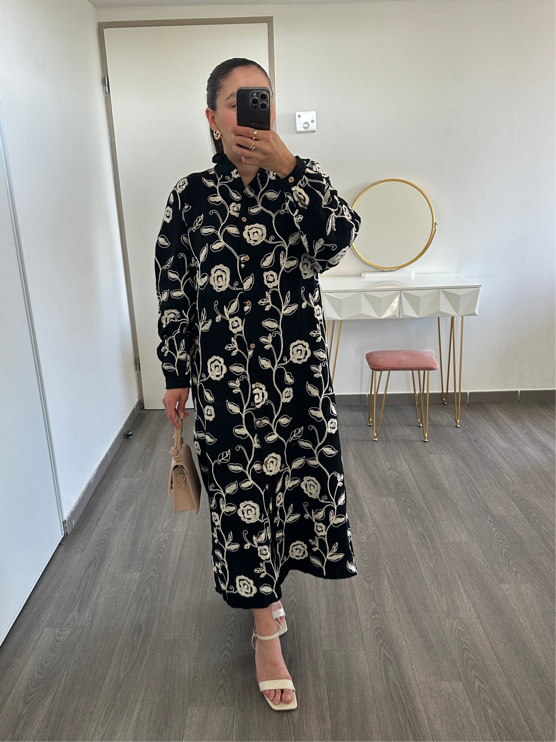 Cette robe noire est ornée de motifs floraux brodés, pour un contraste raffiné. Son col chemise et sa coupe droite lui donnent une allure à la fois décontractée et chic. Grâce à sa longueur midi, elle convient parfaitement à toutes les morphologies.