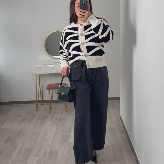 Pour finir, les nuances sombres du pantalon permettent une grande polyvalence. Il se marie parfaitement avec des accessoires sobres, comme un petit sac noir et des talons pointus, pour une touche chic.